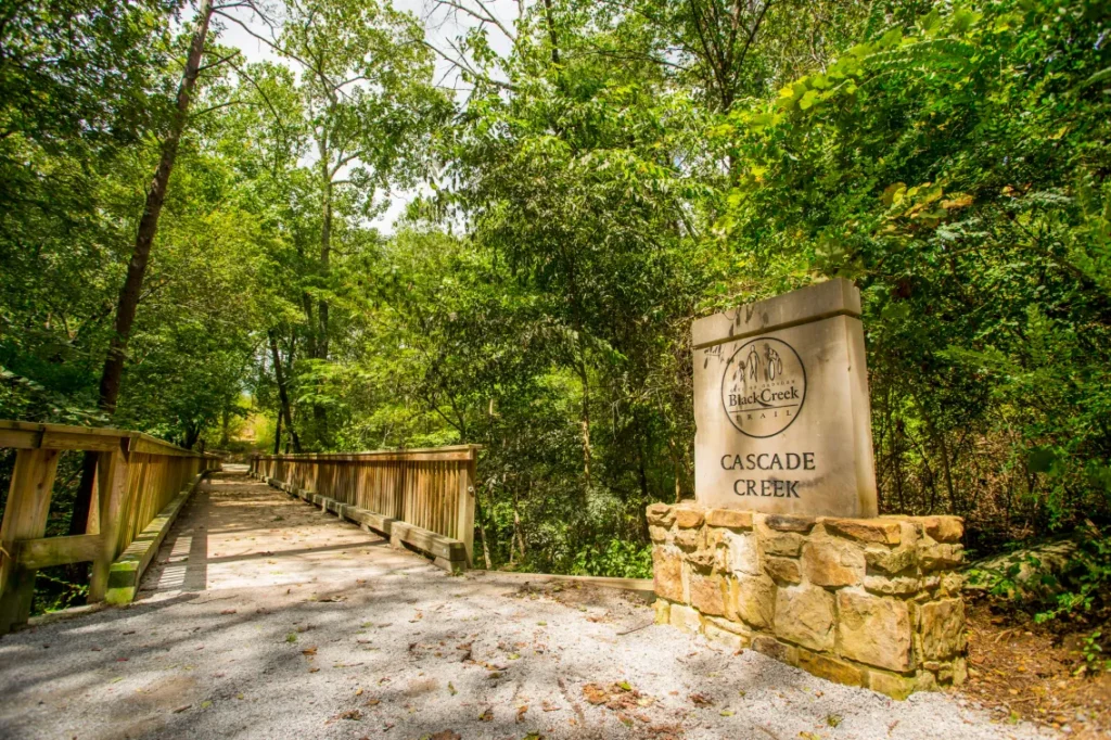 The Black Creek Trail is a 1.7-mile crushed stone path with beautiful scenery along the Black Creek Gorge as it works its way down from Noccalula Falls campground to Black Creek Road. The trail starts at Noccalula Falls Wedding Chapel. Intersecting the main trail are over 15 miles of groomed, single-track trails perfect for walking, running, and mountain-biking.